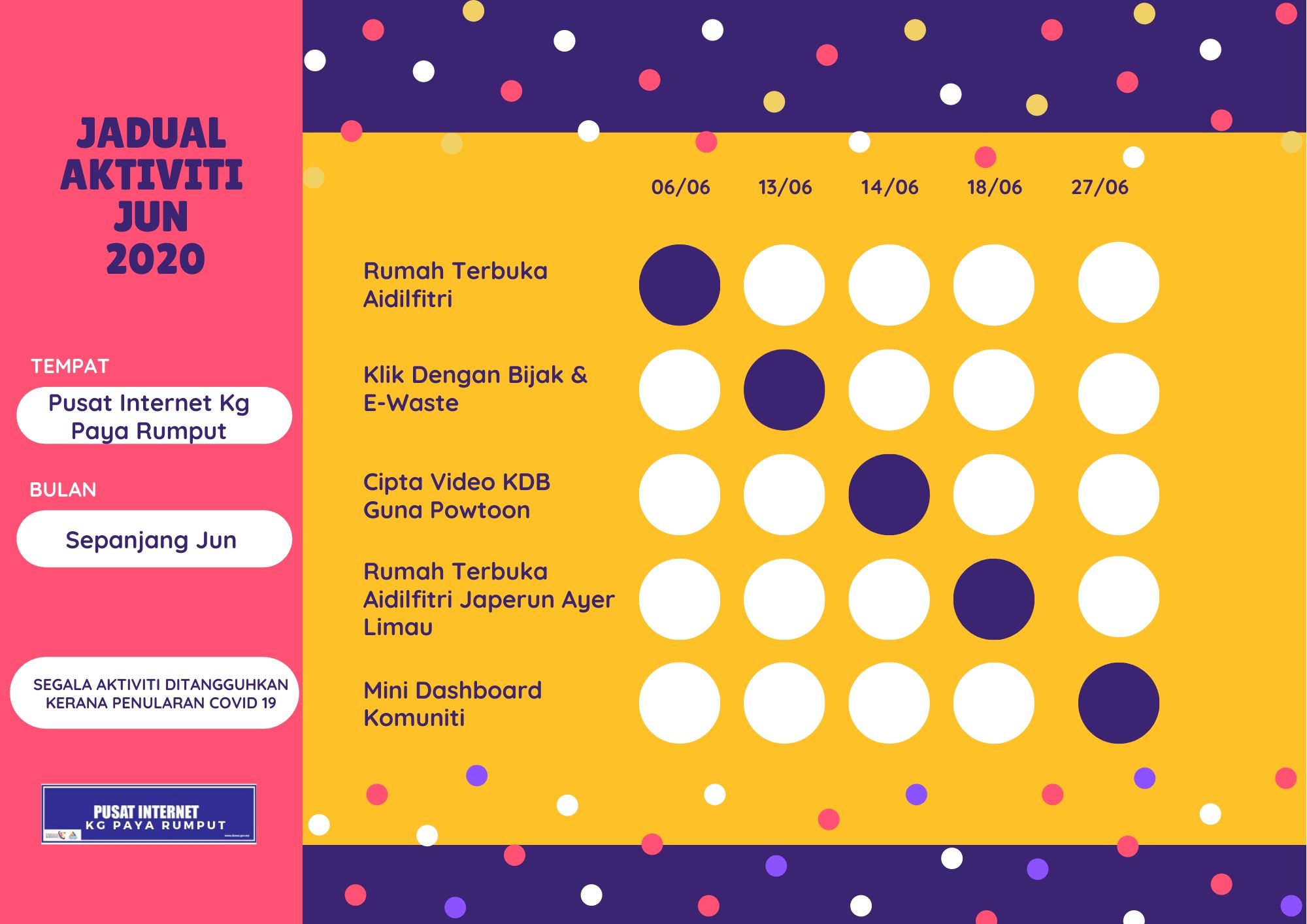 Assalamualaikum, berikut merupakan aktiviti sepanjang bulan April 2020. Aktiviti sepanjang bulan ini ditangguhkan buat sementara waktu, berikutan penularan wabak Covid-19.